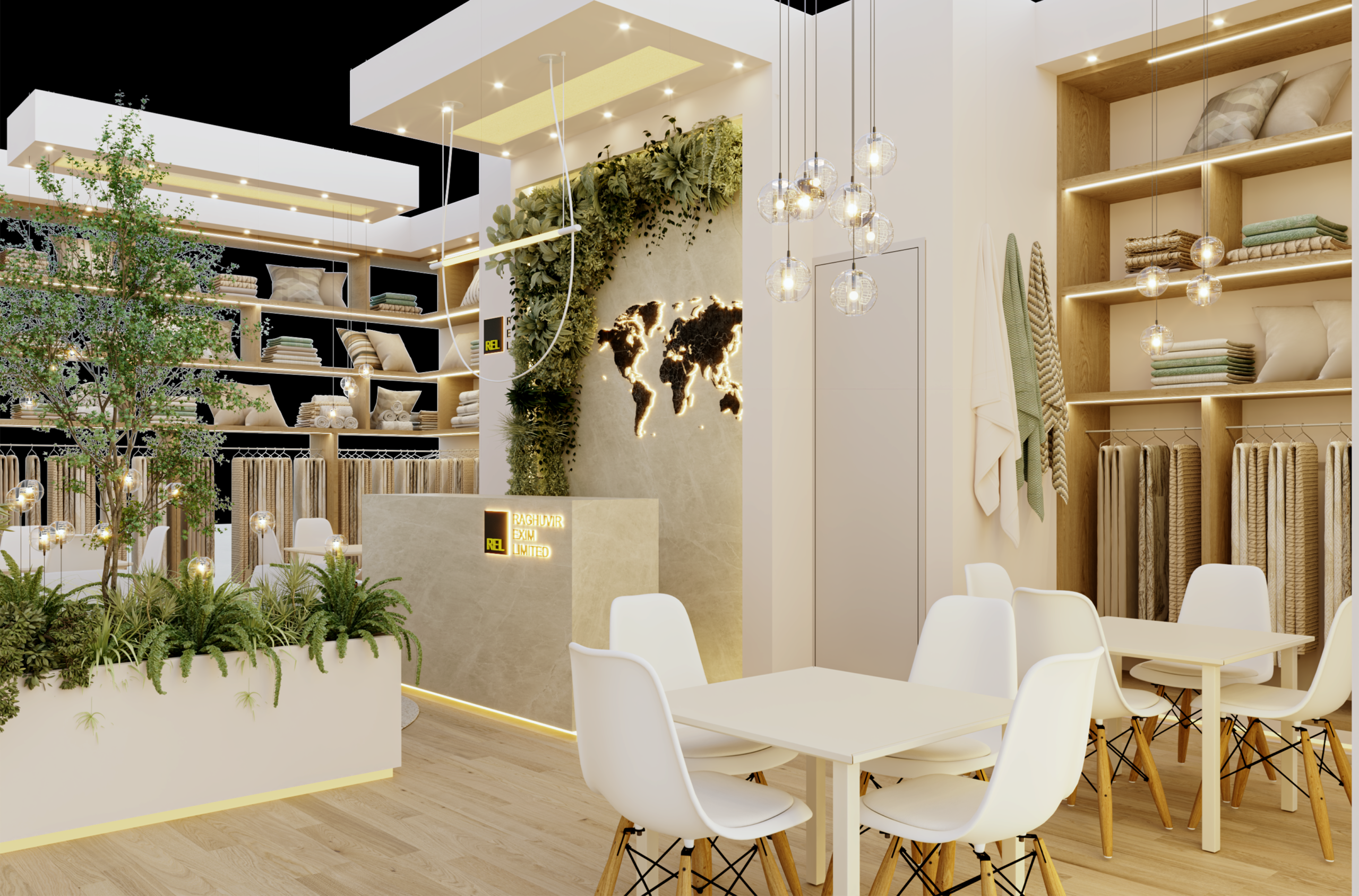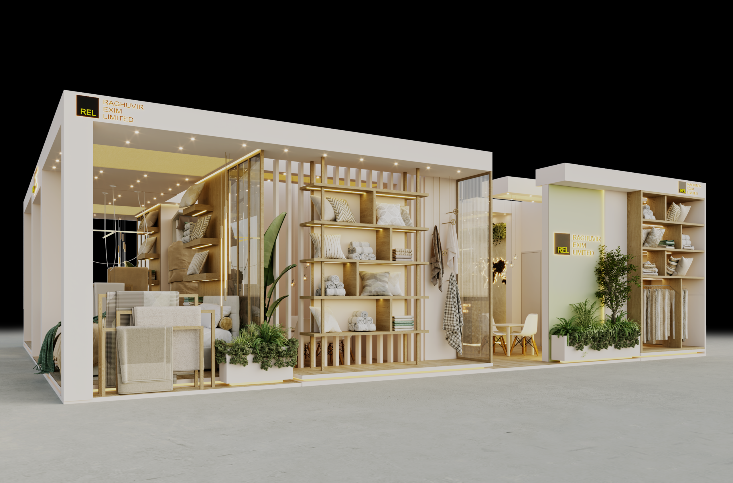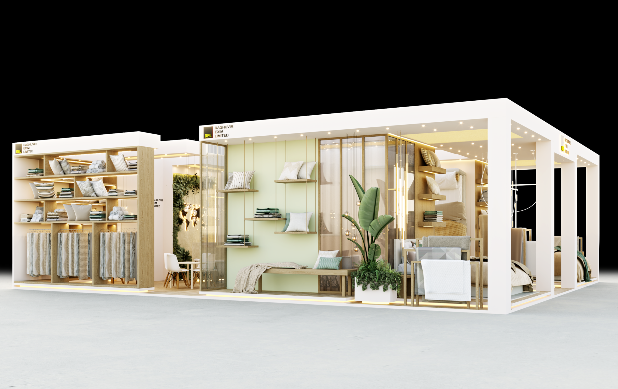 This booth reflects a strong commitment to sustainability and a vision of being a 100% carbon-neutral, “Made in Green” home textile manufacturer from India. Clean layouts, natural tones, warm lighting, and greenery create an inviting, eco-friendly space. Thoughtfully planned product displays, meeting rooms, and seating areas balance professionalism with comfort, leaving a strong and lasting impression at Heimtextil 2026.